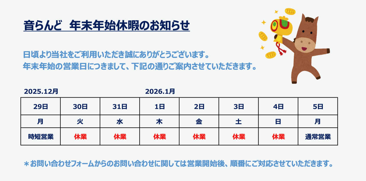 休業期間中のメールでのお問い合わせに対するお返事は、2026年1月5日以降、順次ご連絡いたします。大変ご迷惑をおかけすることと存じますが、何卒ご了承いただきますようお願い申し上げます。